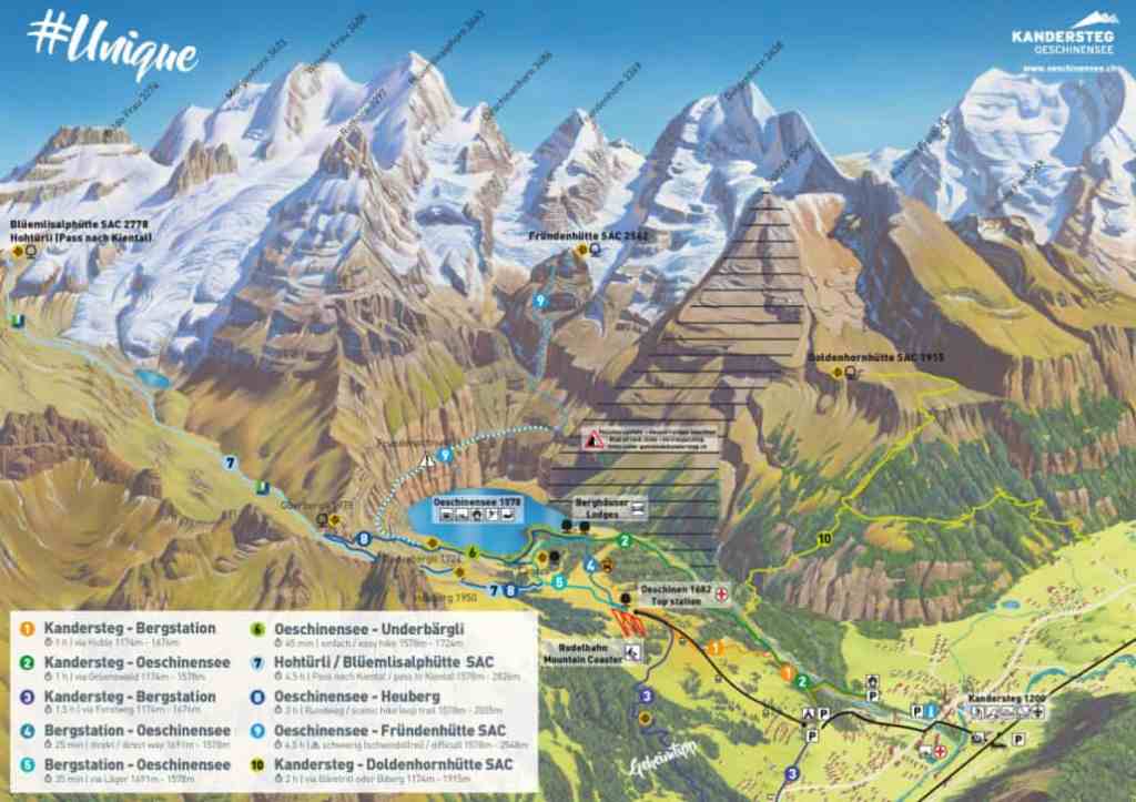 Un peu de géographie pour débuter : le lac d’Oeschinen est alimenté par plusieurs torrents de montagnes en provenance du Doldenhorn, du Fründenhorn du Blümlisalp et du Blümlisalpgletscher. Il coule ensuite vers l’ouest par l’Öschibach qui rejoint la Kander à Kandersteg.